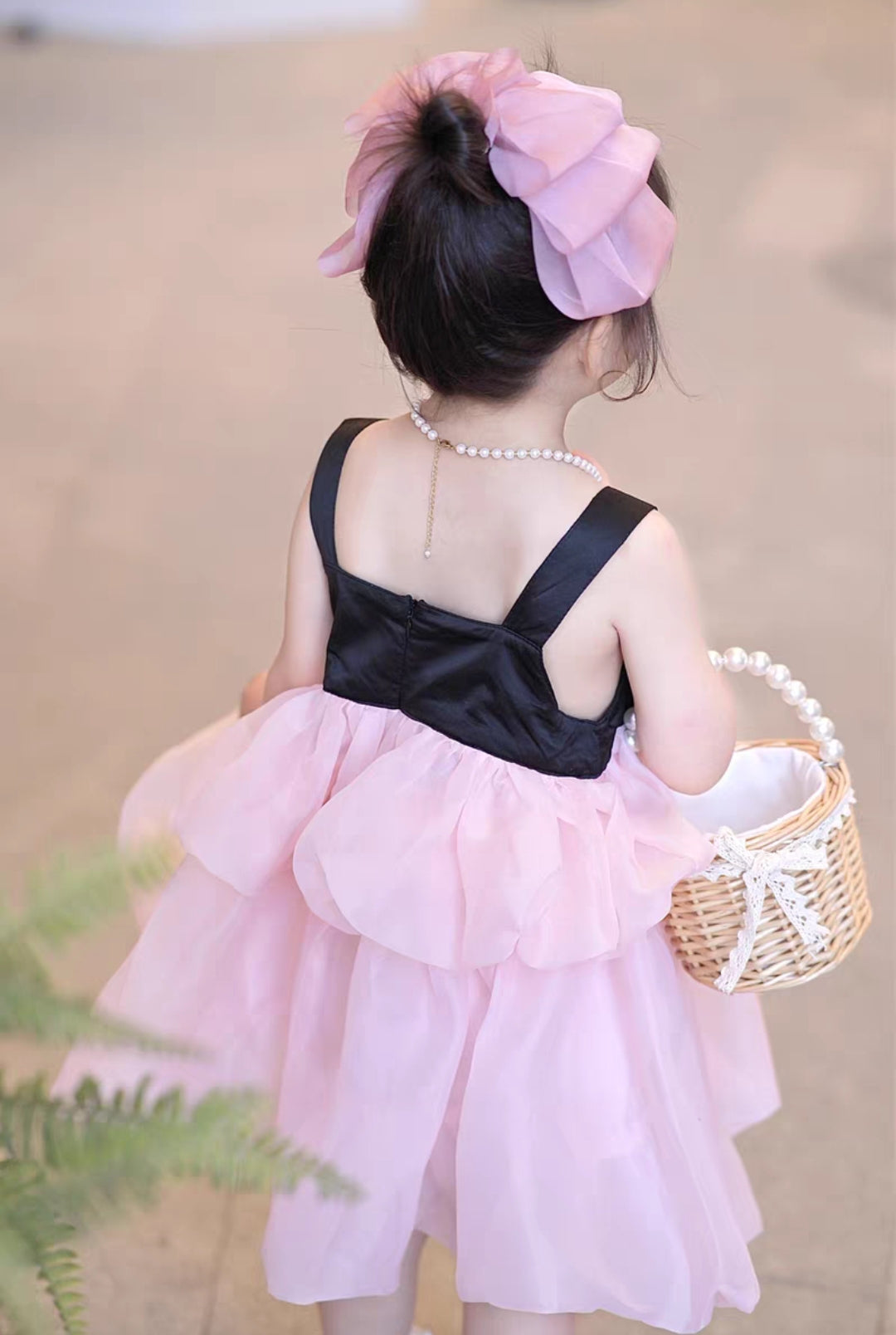 Design: Pink layered dress with black accents and bow